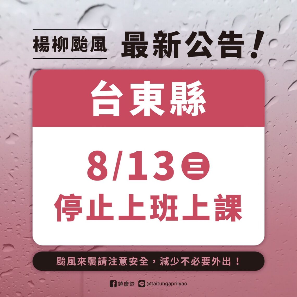 🚨台東縣𝟴/𝟭𝟯㊂停止上班、停止上課