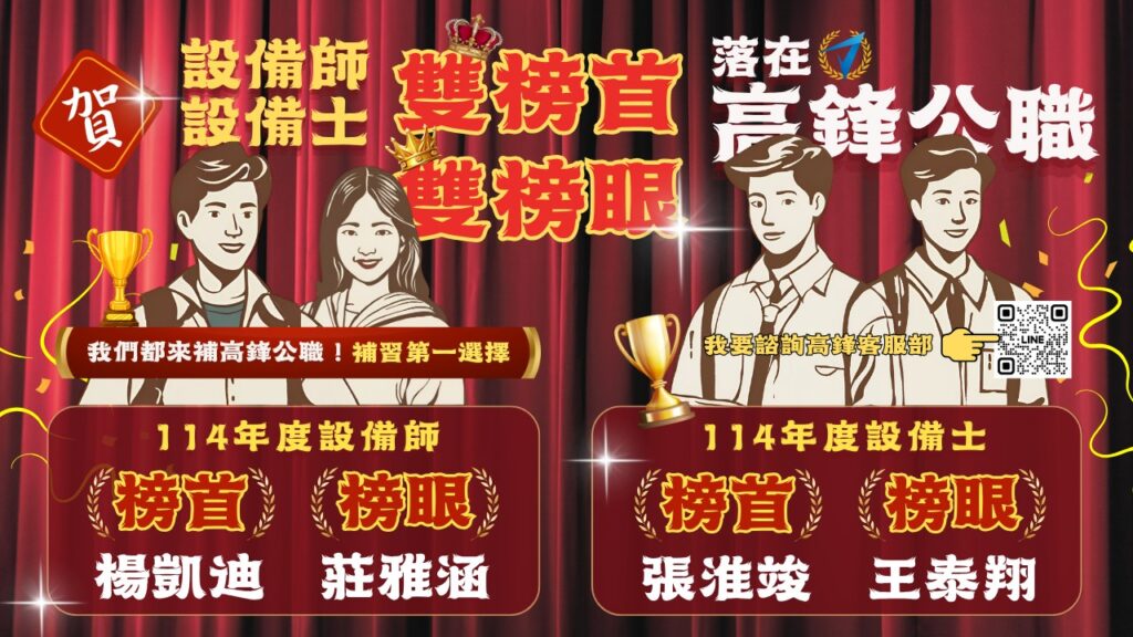消防設備師/士榜單與心得 114年消防設備師 114年消防設備士 上榜人數 0 上榜人數 0 消防設備師上榜心得 114年消防設備師榜首 楊凱迪|亞東科技大學114消防設備師榜眼 莊雅涵|專38期 宜蘭縣政府消防局 高中四榜!! 114年消防設備師 高健展|專30期 景美分隊114年消防設備師 黃薪憲|吳鳳科技大學 114年消防設備師 邱駿瑋|專41期 苗栗縣政府消防局114年消防設備師 蔡子珣|中原大學114年消防設備師 劉于甄|國立成功大學114年消防設備師 王璽淞|台灣警察專科學校114年消防設備師 張哲獎|國防大學中正理工學院114年消防設備師 蘇建宏|警專34期114年消防設備師 江威鴻|大葉大學陸續更新中… 消防設備士上榜心得 114年消防設備士榜首 張淮竣|專31期 台北市政府消防局114年消防設備士榜眼 王泰翔|專35期 高雄市政府消防局114年消防設備士 劉士帆|捷龍消防有限公司114年消防設備士 徐瑋嵐|台灣科技大學114年消防設備士 蕭睿緒|彰化師範大學114年消防設備士 張家銘|新北市政府消防局114年消防設備士 周湘庭|輔仁大學114年消防設備士 鄭郁翰|統新光訊114年消防設備士 劉思妤|中國醫藥大學114年消防設備士 張晉誌|111年特114年消防設備士 羅啟升|茄苳分隊114年消防設備士 劉永鉉|高雄醫學大學114年消防設備士 許智翔|聖約翰科技大學114年消防設備士 林世瀚|朝陽科技大學114年消防設備士 謝秉諺|台灣警察專科學校114年消防設備士 金佳蓉|中興大學114年消防設備士 黃湘群|中國文化大學114年消防設備士 林文軒|宜蘭縣政府消防局114年消防設備士 謝宥詳|國立清華大學114年消防設備士 王暐婷|台中科技大學114年消防設備士 陳善竹|國立高雄大學114年消防設備士 陳立弦|警專28期 桃園市政府消防局114年消防設備士 李亮璇|專19期114年消防設備士 葉典書|苗栗縣政府消防局114年消防設備士 王朝煌|義守大學114年消防設備士 陳昱全|臺北市政府消防局永吉分隊114年消防設備士 郭孟庭|106年特 中庄分隊114年消防設備士 陳柏毓|正修科技大學陸續更新中… 112年消防設備師 上榜人數 0 👑【112年消防設備師】全國第7名_李O叡學員(吳鳳科技大學)上榜心得【112年消防設備師】全國第11名_黃建彰學員上榜心得 112年消防設備士 上榜人數 0 【112年消防設備士】張OO學員(專28期)上榜心得【112年消防設備士】趙O任學員(108年特)上榜心得【112年消防設備士】鄧O偉學員(專38期)上榜心得【112年消防設備士】羅O諭學員(109年特)上榜心得【112年消防設備士】廖O婷學員(長榮大學)上榜心得【112年消防設備士】蔡O鑫學員上榜心得【112年消防設備士】李O龍學員(專34期)上榜心得【112年消防設備士】李O賢學員(專33期)上榜心得【112年消防設備士】全國第29名_邱O程學員(專33期)上榜心得【112年消防設備士】張O毅學員(花蓮縣私立四維高級中學)上榜心得【112年消防設備士】羅O玲學員(致理技術學院)上榜心得【112年消防設備士】李學員(國立台北商業大學)上榜心得【112年消防設備士】李O澤學員上榜心得【112年消防設備士】全國第4名_賴OO學員(109年特)上榜心得【112年消防設備士】全國第10名_葉OO學員(吳鳳科技大學)上榜心得 榜單心得陸續更新中…… 111年消防設備師 上榜人數 0 111年消防設備士 上榜人數 0 🥈【111年消防設備士】林暐傑學員(103特)上榜心得【111年消防設備士】范菁菁學員(國立東華大學)上榜心得【111年消防設備士】廖健華學員(新北市政府消防局 貢寮分隊)上榜心得【111年消防設備士】郭彥宏學員(義守大學)上榜心得【111年消防設備士】陳弘耘學員(103特)上榜心得【111年消防設備士】陳怡璇學員(專34期)上榜心得【111年消防設備士】林琨智學員(專28期)上榜心得【111年消防設備士】王聖瑋學員上榜心得【111年消防設備士】胡智霖學員(中正高工)上榜心得【111年消防設備士】李事晟學員(高雄應用科技大學)上榜心得 110年消防設備師 上榜人數 0 110年消防設備士 上榜人數 0 消防設備師/士程介紹 官方LINE洽詢 Facebook Line Instagram